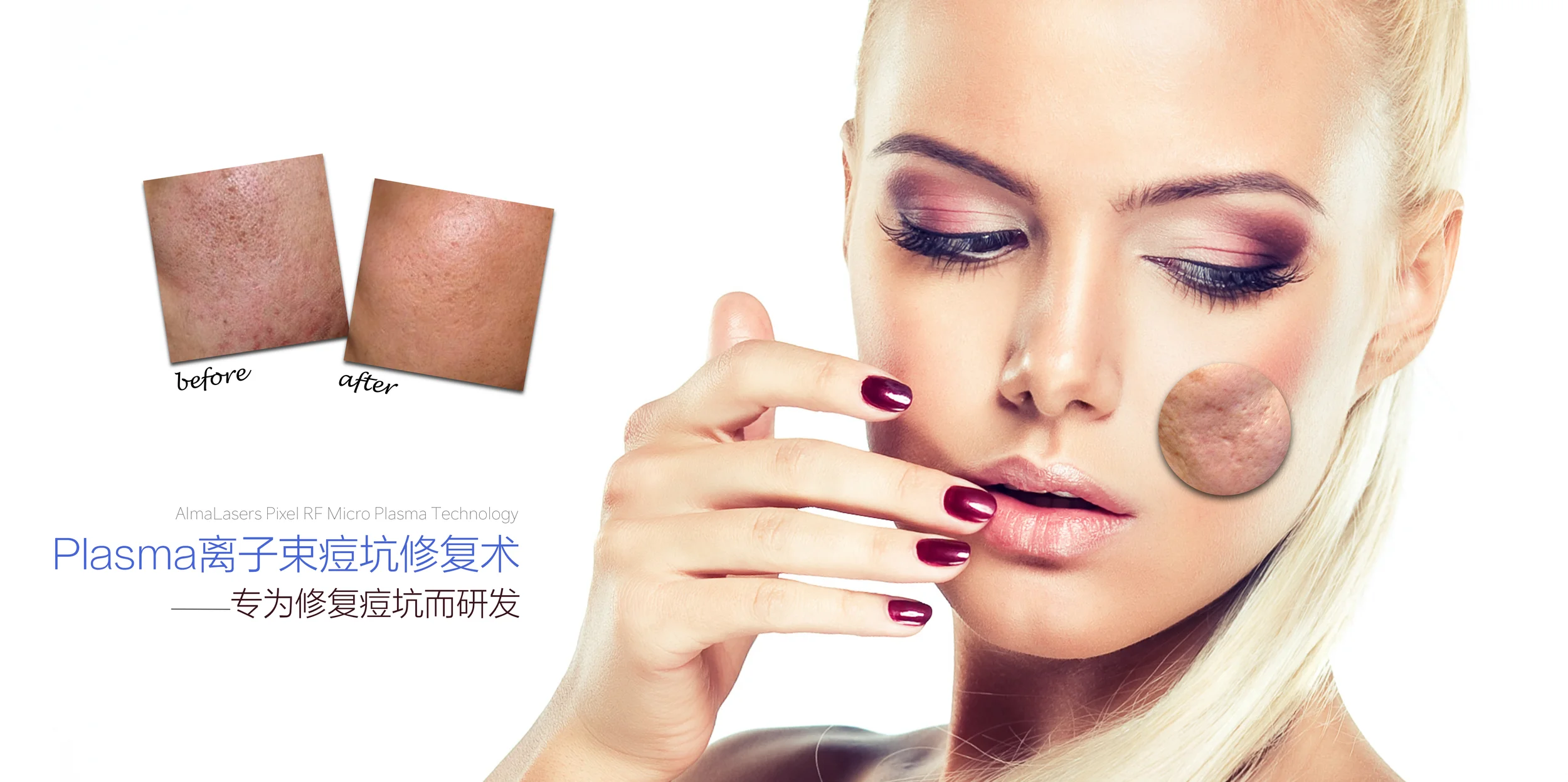 采用先进的Plasma离子束技术,激活皮肤真皮深层胶原再生,填充祛除痘坑。
